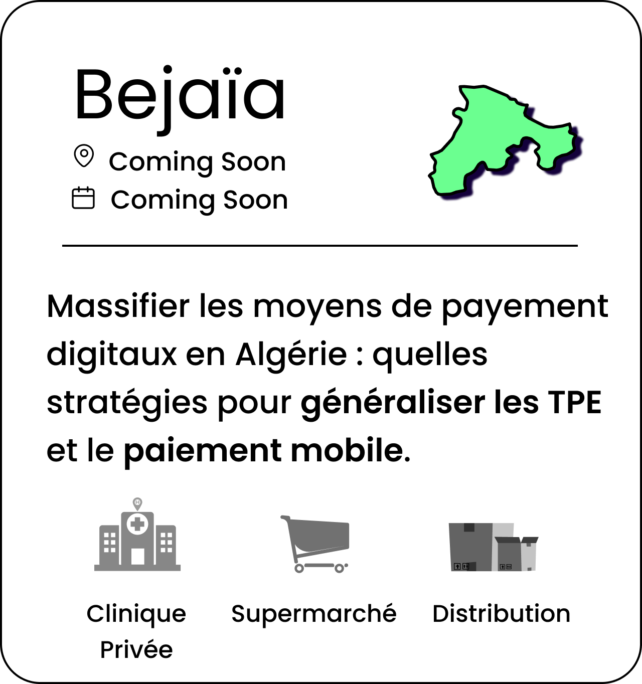 Un hackathon national où les talents tech et design unissent leurs forces pour digitaliser 21 secteurs commerciaux. Chaque wilaya devient un terrain d’innovation, avec trois catégories de secteurs à transformer. Une occasion unique de mettre la technologie au service du commerce de proximité